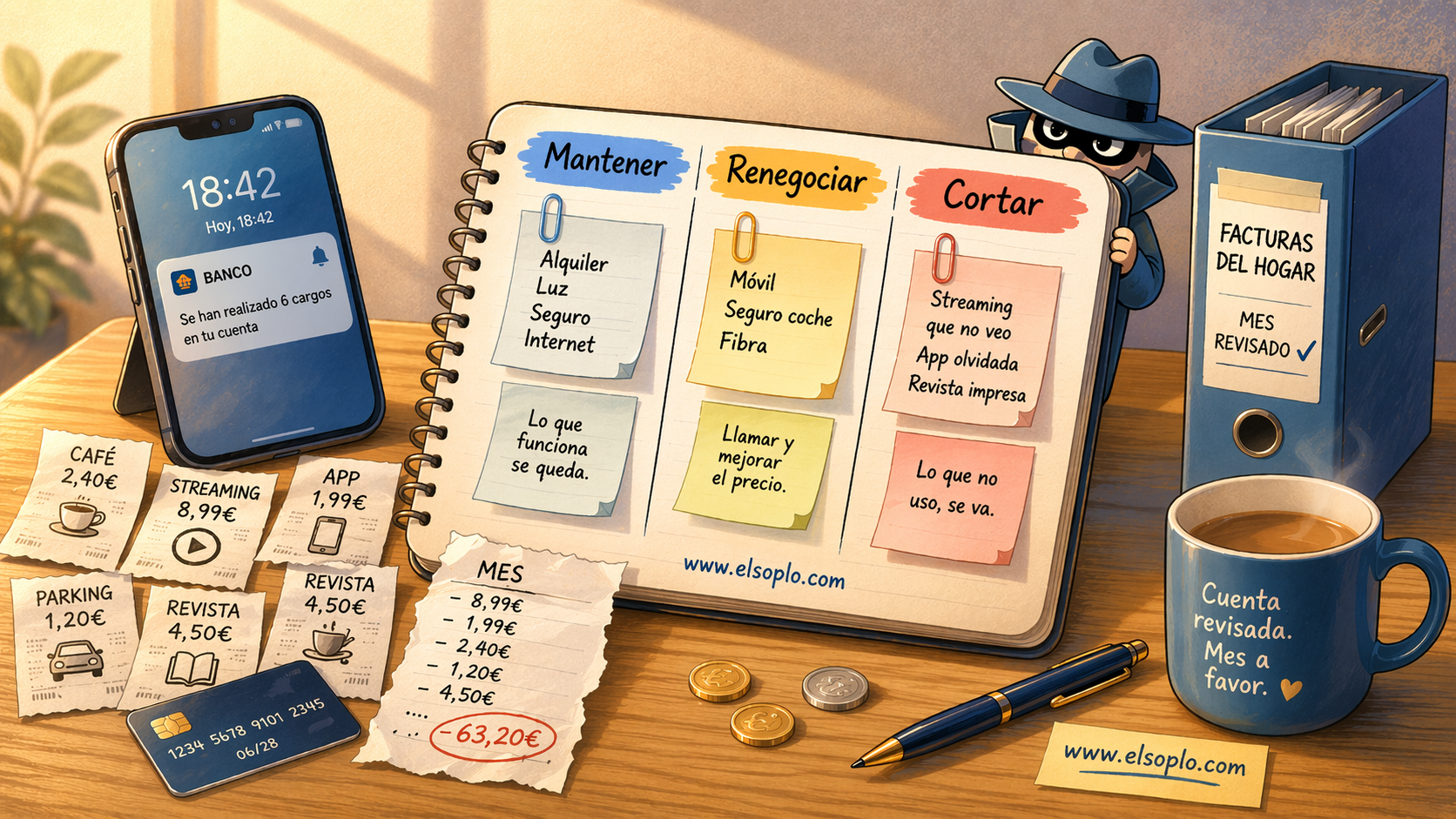 Hay meses que no se rompen por un sablazo grande, sino por veinte mordiscos pequeños. Este soplo propone una barrida mensual en tres colores —mantener, renegociar y cortar— para que el dinero deje de escaparse por sitios que ya ni miras.