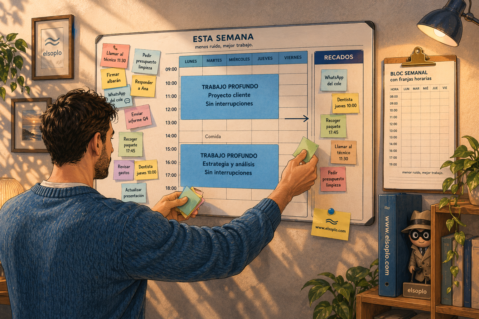 Este soplo entra por una escena demasiado conocida: empiezas el día con intención decente y, dos correos, tres avisos y cuatro microtareas después, ya estás trabajando en migas. No propone volverte un monje del calendario. Propone algo más útil: sacar los recados de en medio y proteger dos ventanas serias para que el día no acabe convertido en picoteo con teclado.